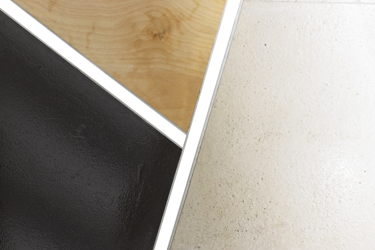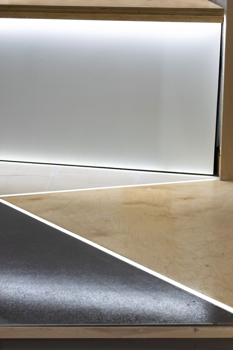 Οι υποχωρήσεις του σοβά δημιουργούν απαλές σκιές που συμβάλουν στο γενικότερο παιχνίδι της προοπτικής. Η επεξεργασία του «χτενιστού» σοβά οριοθετείται από ένα ξύλινο πηχάκι λευκής σημύδας που διατρέχει ολόκληρη τη περίμετρο του showroom και διαμορφώνει το κατώφλι των δοκιμαστηρίων.