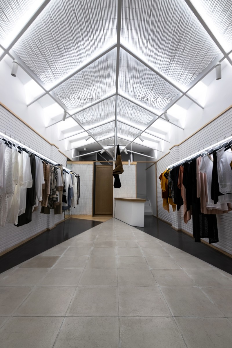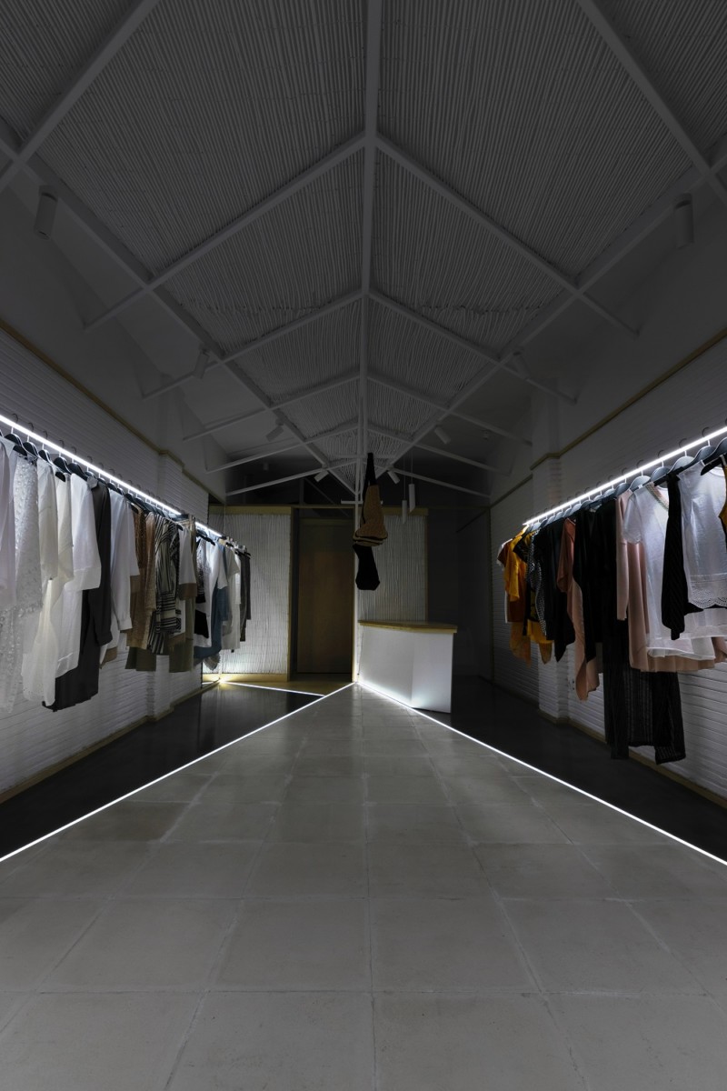 Οι πλάγιες ζώνες δειγματισμού αποτελούνται από τσιμεντοκονία σε σκούρο γκρι απόχρωση που έρχεται σε αντίθεση με την υπόλοιπη φωτεινή παλέτα υλικών και τονίζει τα ρούχα που κρέμονται από πάνω της.