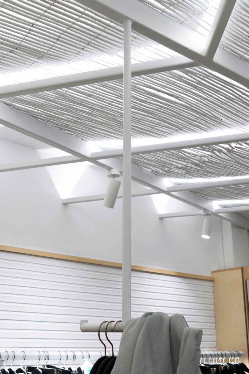 The pergkola is inclined, with the lower-height end situated at the inner end of the showroom, thus offering a dynamic sense of perspective as well as leading the visitor to the fitting rooms. The pergkola’s skin consists of white-painted cane rolls, supported by secondary steel beams which incorporate hidden diffuse light. The whole pergkola construction was perceived as a reinterpretation of the herringbone pattern and the traditional shading structures found quite often in the Greek islands.