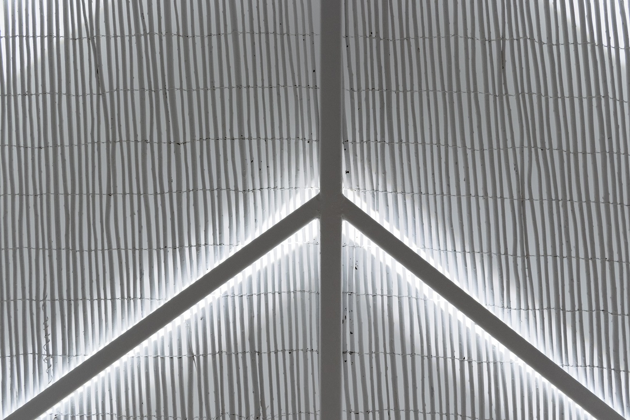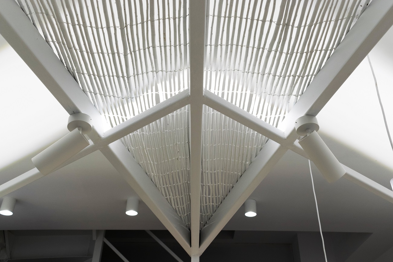 Η πλήρωση της πέργκολας γίνεται από παραδοσιακό ρολό καλαμωτής σε λευκό χρώμα, η οποία συγκρατείται στη θέση της από δευτερεύοντα μεταλλικά δοκάρια που φέρουν κρυφό διάχυτο φωτισμό. Ολόκληρη η κατασκευή της πέργκολας γίνεται αντιληπτή ως μια επανερμηνεία του «ψαροκόκαλου» και των κατασκευών σκίασης που συναντώνται στα ελληνικά νησιά.